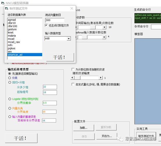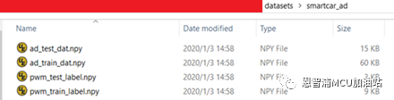 这里我们使用14位来量化模型,对于NNCU工具,9-16位都会使用16位整数来封装。 16位量化和8位量化相比,以牺牲少量模型推理时间和加倍模型数据的代价,换来几乎无损的精度。这里还有个重要的小建议:虽然使用16位整数来表达,但实际最好只使用其中的9-15位(未用的位会自动做有符号扩展),是为了防止模型运算期间的乘累加溢出。 注意输入数据移位指数7位,这意思是说数据里有7个二进制位用于表达分数(或者说是小数)部分。回想前文提到测试集和训练集中数据范围是-128~+127,而模型训练时,模型处理数据范围是-1~+1,所以量化数据里其实是放大到128倍了,也就是7个二进制分数位。 我们再看“输出后处理类型“。由于模型是做预测,后处理需要用户自己处理,不需要执行引擎后处理。中间层、输出层分数位数:由于模型输出是-1~+1之间,10位分辨率也比较够用,这里占用量化总位数14位中的10位来表达分数。大家也可以试试其它的,比如9-13,一般影响极小。点击”干活!”,会跳出后台转换脚本的命令窗口,稍候片刻会在nncu_pc目录下生成model1.nncu.c---模型执行文件。那么怎么使用以及模型量化后性能怎么样呢? 测试性能,首先需要制作测试数据集。我们把ad_test_dat.npy作为输入,把模型计算结果和pwm_test_label.npy值的平方差作为误差,计算平均差值来评估量化后的模型性能。 把训练集和测试集复制到”datasets\smartcar_ad”目录,命名如下: