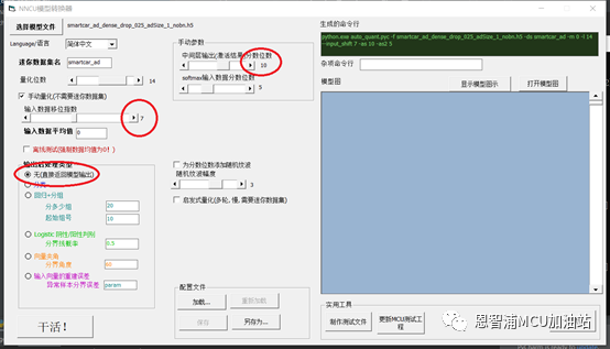 经过多轮的训练,我们得到最终的模型文件smartcar.h5。 那么怎么部署到小车上呢,这要借助“NNCU”这一套神器了。NNCU模型转换器可以点击这里[color=var(--weui-LINK)]从网盘下载,这里有个大礼包,里面有nnCU工具、教学视频、用户手册,还有一个MCU+AI的ppt。通过转换器把模型转换成C文件。这样就可以很方便的集成到原有的工程中了,注意还需要集成一些依赖库和算法库,可以参考性能测试工程(nncie_stub.uvproj)。从网盘中下载解压nncu_test_nighty.7z,运行“nncu_vbgui.bat”,选择模型文件,配置信息如下: